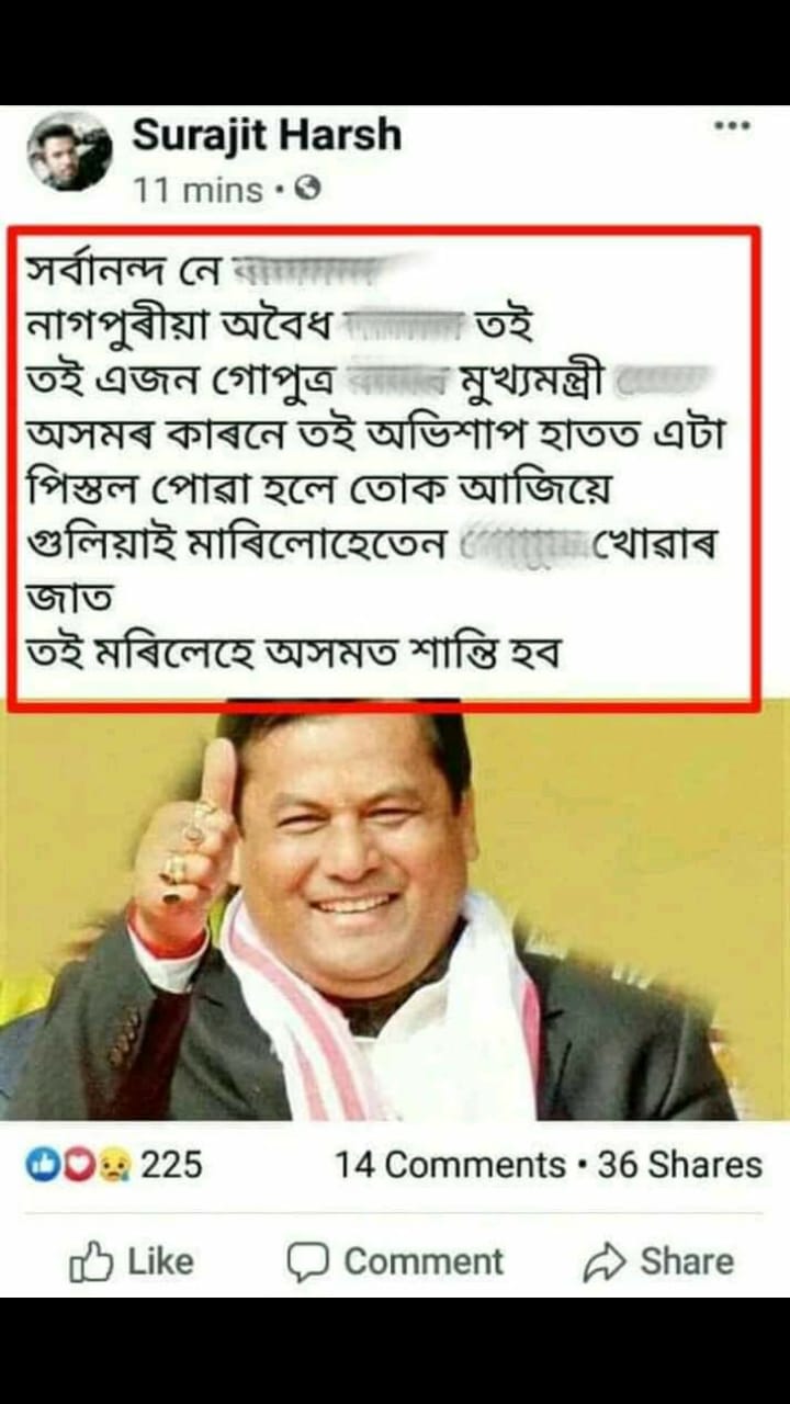 চ’চিয়েল মিডিয়াত পিষ্টল পালে মুখ্যমন্ত্ৰীক গুলীয়াই মাৰিম বুলি ভাবুকি যুৱকজনৰ। ফেচবুকত দিয়া এই পোষ্টটোত যুৱকজনে প্ৰয়োগ কৰিছিল বহু অশ্লীল শব্দ ।