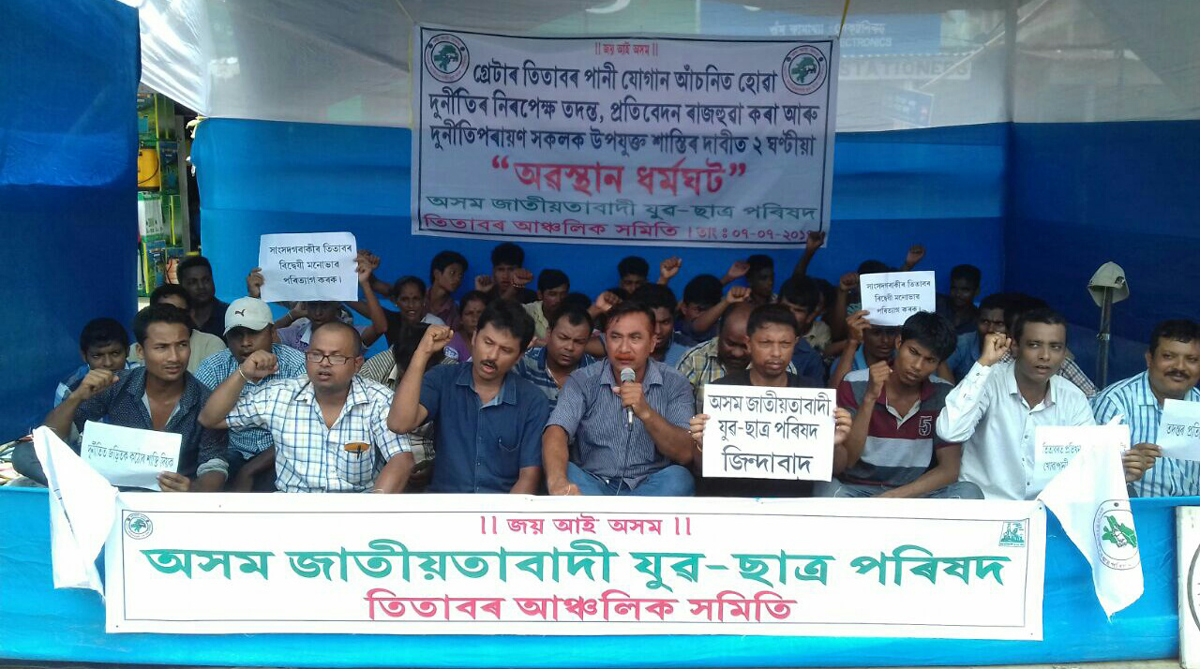 তিতাবৰ, ৭ জুলাইঃ এছিয়া মহাদেশৰ সৰ্ববৃহৎ পানীযোগান আঁচনি গ্ৰেটাৰ তিতাবৰ পানীযোগান আঁচনিৰ বৃহৎ কেলেংকাৰীৰ উচিত তদন্ত কৰাৰ দাবীত অসম জাতীয়তাবাদী যুৱ ছাত্ৰ পৰিষদৰ তিতাবৰ আঞ্চলিক সমিতিয়ে দুইঘন্টীয়া অৱস্থান ধৰ্মঘট কাৰ্য্যসূচী ৰূপায়ন কৰে। উল্লেখ্য যে, তিতাবৰৰ ভূ-গৰ্ভৰ পানীত বিষাক্ত আৰ্ছেনিক ধৰা পৰাৰ পিছত তদানীন্তন মুখ্যমন্ত্ৰী তৰুণ গগৈয়ে নিজ গৃহ সমষ্টি তিতাবৰৰ ৰাইজক আৰ্ছেনিকমুক্ত বিশুদ্ধ পানী সেৱণৰ উদ্দেশ্যে এখন এশ কোটি টকীয়া এছিয়াৰ মহাদেশৰ ভিতৰত সৰ্ববৃহৎ পানীযোগান আঁচনি নিৰ্মাণ কৰিছিল। এই আঁচনি খনক গ্ৰেটাৰ তিতাবৰ পানীযোগান আঁচনি নামেৰে নামাংকিত কৰা হয়। জনস্বাস্থ্য কাৰিকৰী বিভাগৰ মন্ত্ৰী গৌতম ৰয়ৰ কার্যকালত এই আঁচনি খনৰ কেলেংকাৰী সংঘটিত হোৱা অভিযোগ উত্থাপন হৈছিল। গোলাঘাটৰ ধনশিৰি আৰু দৈয়াং নদীৰ পৰা পানী পৰিবাহী পাইপ স্থাপন, ৰিজাৰ্ভাৰ নিৰ্মাণ তিতাবৰ সমষ্টিত মুঠ এশটা পানী যোগান প্ৰকল্প স্থাপন, বৈদ্যুতিক সা-সামগ্ৰী ক্ৰয় আৰু স্থাপনৰ নামত ভয়াবহ দুৰ্নীতি সংঘটিত হোৱাৰ তথ্য পোহৰলৈ আহিছিল। সেই সময়ৰ কংগ্ৰেছ শাসিত চৰকাৰখনৰ মুখ্যমন্ত্ৰী তৰুণ গগৈ আৰু জনস্বাস্থ্য কাৰিকৰী বিভাগৰ মন্ত্ৰী গৌতম ৰয় সন্মুখতে একাংশ ঠিকাদাৰ, মন্ত্ৰী, নেতা-পালিনেতা তথা জনস্বাস্থ্য কাৰিকৰী বিভাগৰ বিষয়ববীয়াৰ দুৰ্নীতিৰ ফলত তিতাবৰৰ ৰাইজে নদীৰ পানী খাবলগীয়া হৈছিল। বিভিন্ন দল সংগঠনে এই কেলেংকাৰীৰ উচিত তদন্ত কৰিবলৈ বিভিন্ন সময়ত প্ৰতিবাদী কার্যসূচী ৰূপায়নৰ লগতে সৰ্বা নেতৃতাধীন চৰকাৰক বাৰম্বাৰ আবেদন কৰাৰ পিছত মুখ্যমন্ত্ৰী সৰ্বানন্দ সোনোৱালৰ বিশেষ তদাৰকৰ দল তিতাবৰলৈ প্ৰেৰণ কৰিছিল। কিন্তু তদাৰককাৰী দলটোৱে পৰ্যবেক্ষণ কৰে যদিও কোনো বিহিত ব্যৱস্থা গ্ৰহণ নকৰিলে। অসম জাতীয়তাবাদী যুৱ ছাত্ৰ পৰিষদৰ তিতাবৰ আঞ্চলিক সমিতিয়ে সমগ্ৰ ঘটনাৰ উচিত তদন্ত আৰু দুৰ্নীতিগ্ৰস্ত ব্যক্তিক উচিত শাস্তি দিয়াৰ দাবীত তিতাবৰত অৱস্থান ধৰ্মঘট কাৰ্য্যসূচী ৰূপায়ন কৰে। লগতে সোনোৱাল চৰকাৰক অতি শীঘ্ৰে তদন্ত কৰি দোষী ব্যক্তিক শাস্তি দিয়াৰ লগতে তদন্তৰ প্ৰতিবেদন ৰাজহুৱা কৰিবলৈ দাবী জনায়।
