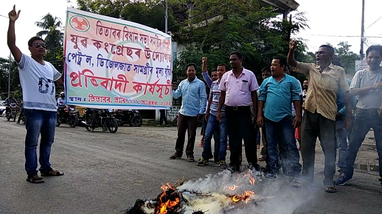 তিতাবৰ, ২১ ছেপ্টেম্বৰঃ পে’ট্ৰল ডিজেলকে ধৰি ইন্ধনজাত সামগ্ৰীৰ অত্যাধিক মূল্যবৃদ্ধিৰ প্ৰতিবাদ তিতাবৰত যুৱ কংগ্ৰেছে উত্তাল প্ৰতিবাদ সাব্যস্ত কৰে৷ যুৱ কংগ্ৰেছীয়ে প্ৰধানমন্ত্ৰী নৰেন্দ্ৰ মোডীৰ প্ৰতিকৃতি দাহ কৰি চৰকাৰ বিৰোধী শ্ল’গানেৰে চৌদিশ উত্তাল কৰি তোলে৷ উল্লেখ্য যে, সম্প্ৰতি পে’ট্ৰল ডিজেলকে ধৰি ইন্ধনজাত সামগ্ৰীৰ অত্যাধিক মূল্যবৃদ্ধিয়ে সৰ্বসাধাৰণক জুৰুলা কৰিছে৷ নিৰ্বাচনৰ প্ৰাকক্ষণত শাসকীয় দলটোৱে সামগ্ৰীৰ অত্যাধিক মূল্যবৃদ্ধি ৰোধৰ প্ৰতিশ্ৰুতিৰে শাসনৰ বাঘজৰী হাতত লৈ বৰ্তমান ওলোটা খৰ মৰা অভিযোগ কৰি যুৱ কংগ্ৰেছে তীব্ৰ প্ৰতিবাদ সাব্যস্ত কৰে৷ প্ৰতিবাদকাৰীসকলে চৰকাৰখনক শীঘ্ৰে পে’ট্ৰল ডিজেলকে ধৰি ইন্ধনজাত সামগ্ৰীৰ অত্যাধিক মূল্যবৃদ্ধি নিয়ন্ত্ৰণ কৰাৰ দাবী জনায়।