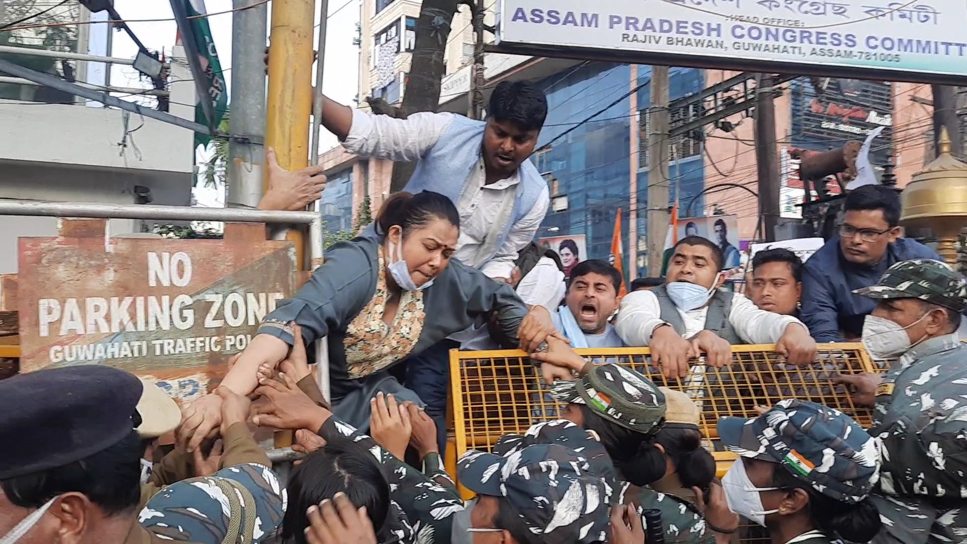 ৰাজীৱ ভৱনৰ প্ৰৱেশ দুৱাৰ উত্তাল কৰি তোলে যুৱ কংগ্ৰেছৰ কৰ্মীয়ে। ৰাজীৱ ভৱনৰ প্ৰৱেশ দুৱাৰত আৰক্ষীয়ে বেৰীকেড লগাই ৰাজপথলৈ ওলাই অহাত বাধা প্ৰদান কৰে যুৱ কংগ্ৰেছৰ কর্মী সকলক। যুৱ কংগ্ৰেছ কর্মী সকলক প্ৰতিবাদী সমদল উলিয়াই কামৰূপ মহানগৰ জিলা উপায়ুক্তক স্মাৰক পত্ৰ প্ৰদানত বাধা প্ৰদান কৰে আৰক্ষীয়ে।