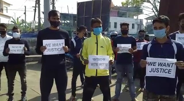 ন্যায় বিচাৰি নলবাৰীৰ ৰাজপথলৈ ওলাই আহিল একাংশ ভুক্তভোগী যুৱক। প্ৰতিবাদ সাব্যস্ত কৰা এই যুৱক সকলে আমাক ন্যায় লাগে, আমাক ন্যায় দিয়ক আদি শ্ল’গানেৰে প্ৰতিবাদস্থলী উত্তাল কৰি তোলে।
